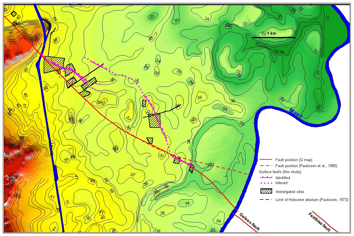 Our contribution to the new EC-project SAFE ("Slow Active Faults in Europe"), which started in 2000, is aimed at the SE-ward extension of the Bree fault scarp in the Belgian Maas valley (Fig. 3). Between the villages of Neeroeteren and Bichterweert, the Feldbiss fault zone transects the younger terraces of the Maas river, covered by late Weichselian coversands, and the Holocene alluvium, joining with the Geleen and Feldbiss faults in the Netherlands (Fig. 4). The geomorphic expression of these fault segments is much reduced compared to the Bree fault scarp. Considering the low slip rates of these faults (< 0.1 mm/yr.), it is clear that the fault scarp morphology in the Maas valley does generally not exceed that of other landforms such as land dunes, small local drainage features, terrace scarps, and artificial landforms. It is therefore difficult to determine the precise location of these faults, and thus also to evaluate their activity.
