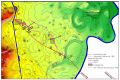 Fig. 4 – Elevation map of the Maas valley between the villages of Neeroeteren (in the NW) and Bichterweert (in the SE). From W to E, the Feldbiss fault zone consists of the Heerlerheide fault, the Geleen fault and the Feldbiss fault. The Geleen fault is generally considered the most active fault. The Heerlerheide fault is so far poorly investigated, although it has clearly controlled the limits of the Saalian and Weichselian Maas terraces, and of some incisions in the Holocene alluvial plain.