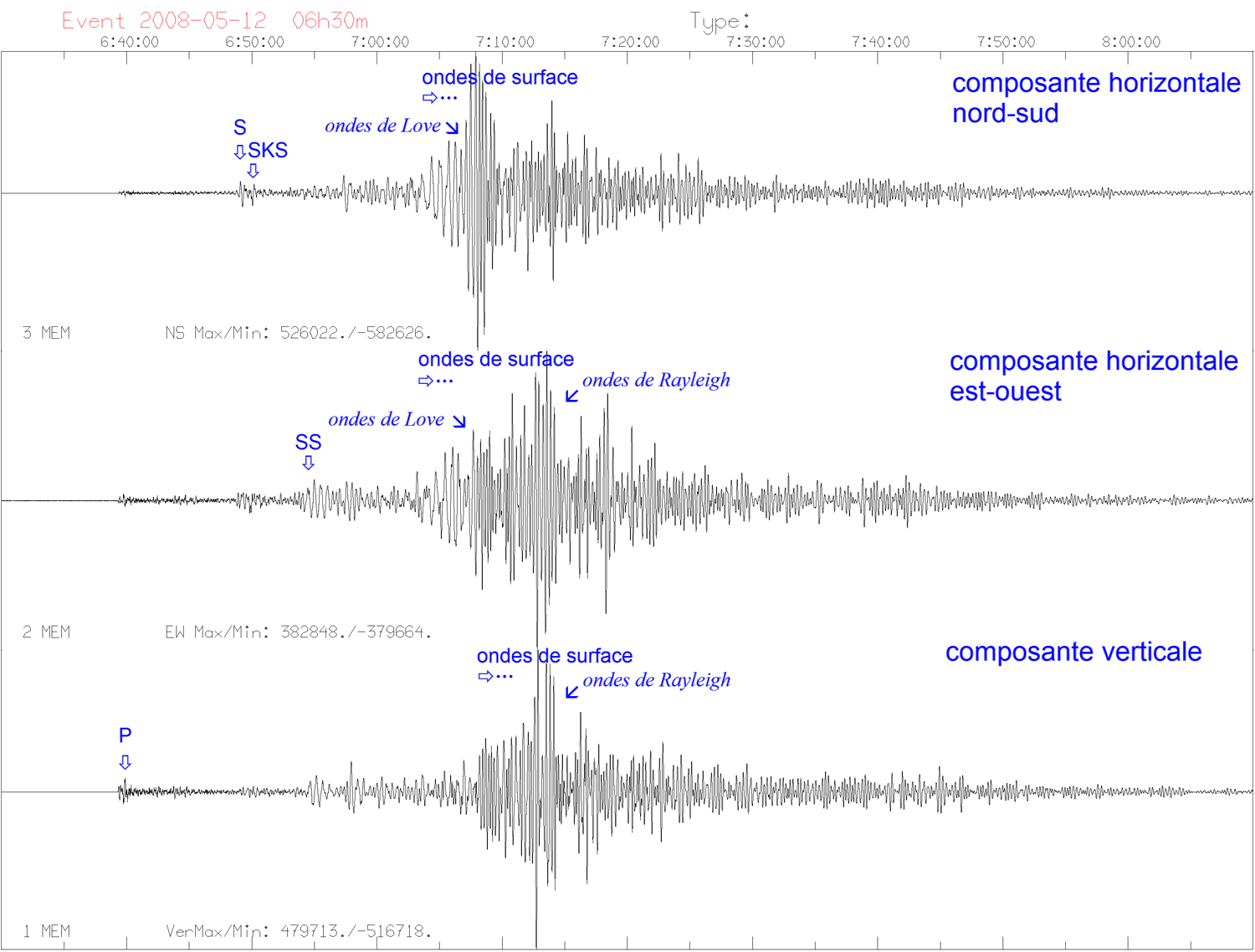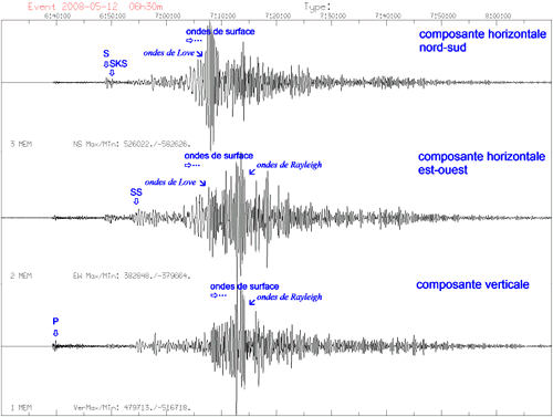 Enregistrement du tremblement de terre du 2008-mai-12 à Sichuan (Chine) par les stations du réseau sismique belge.