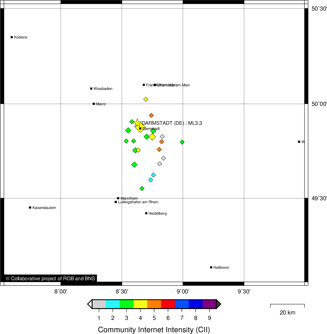 Coordonnées de l'épicentre 49.899° N, 8.626° E Incertitude ± 6.3 km
