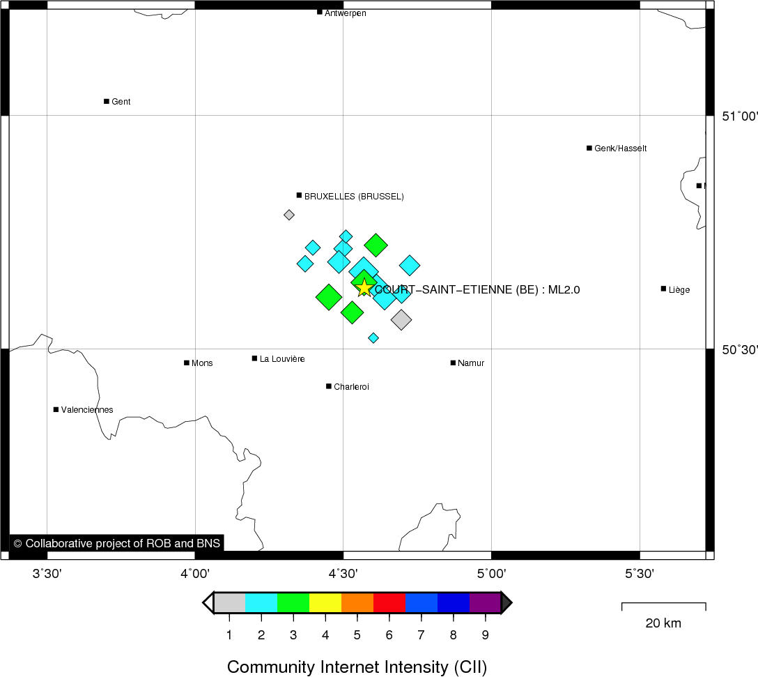 Metingen door het Duits seismometernetwerk van het aardbevingsstation Bensberg (Universiteit van Keulen, Duitsland)