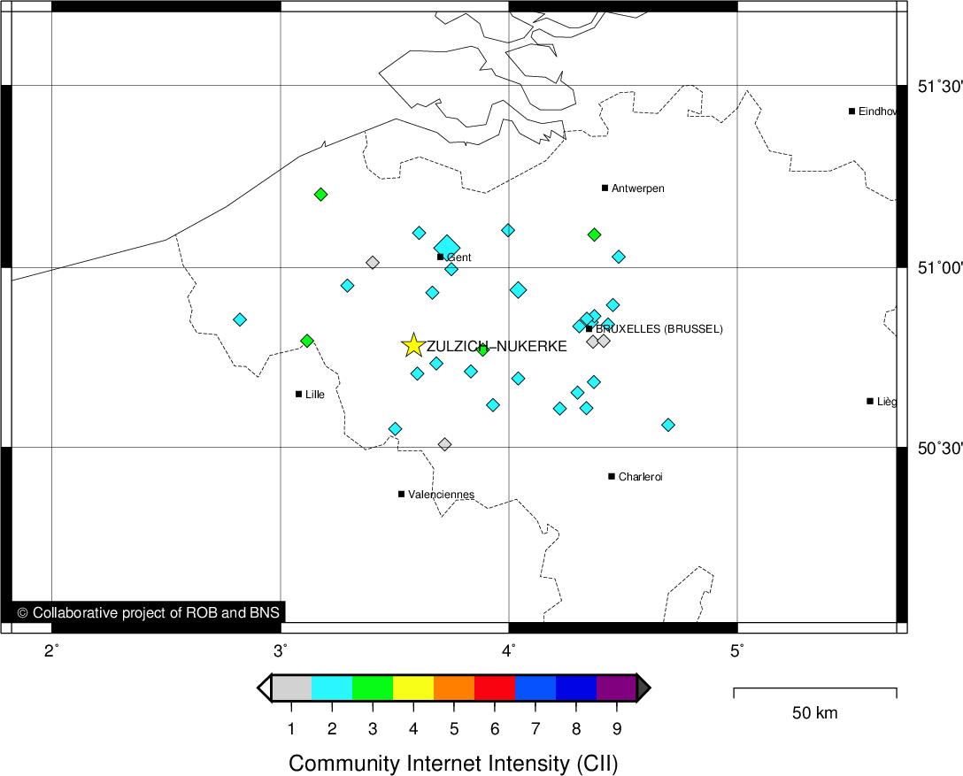 Waarschuwing! De intensiteiten afkomstig van de macroseismische enquête zijn ruwe gegevens die nog niet geverifieerd werden.