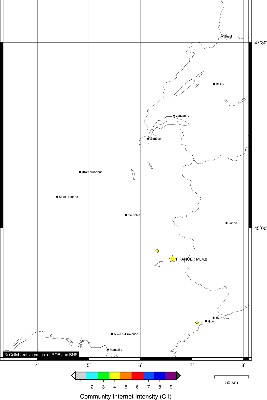Lage des Epizentrums 44.570° N, 6.620° E Unsicherheit ± 3.9 km