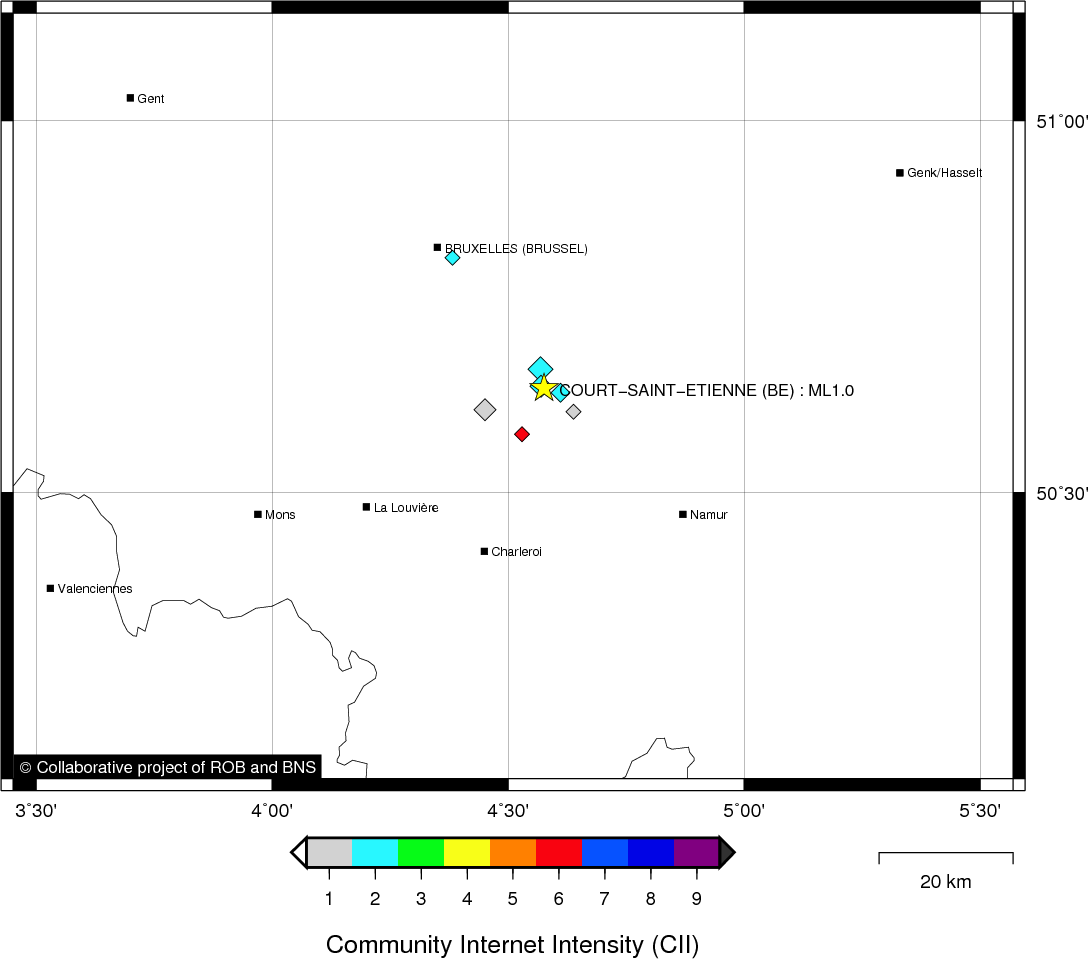 Epicentral coordinates 50.641° N, 4.577° E Uncertainty ± 0.8 km