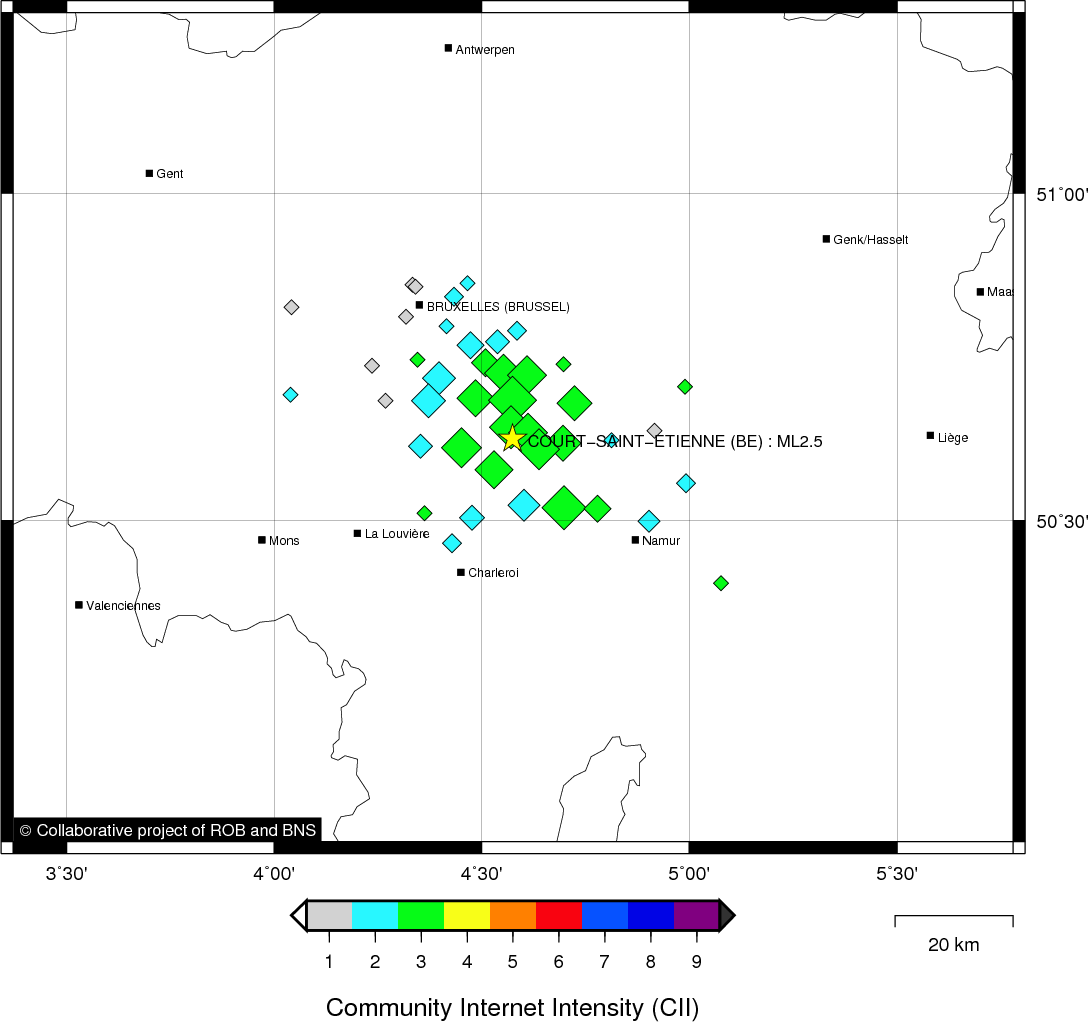| Epicentral coordinates | 50.625° N, 4.575° E Uncertainty ± 0.6 km |