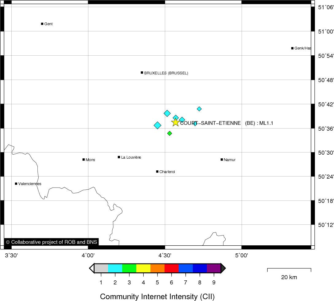 Epicentral coordinates 50.624° N, 4.570° E Uncertainty ± 0.6 km