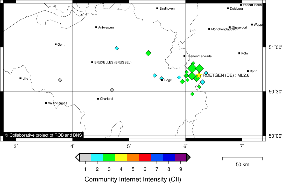 Coordonnées de l'épicentre 50.684° N, 6.236° E Incertitude ± 0.5 km